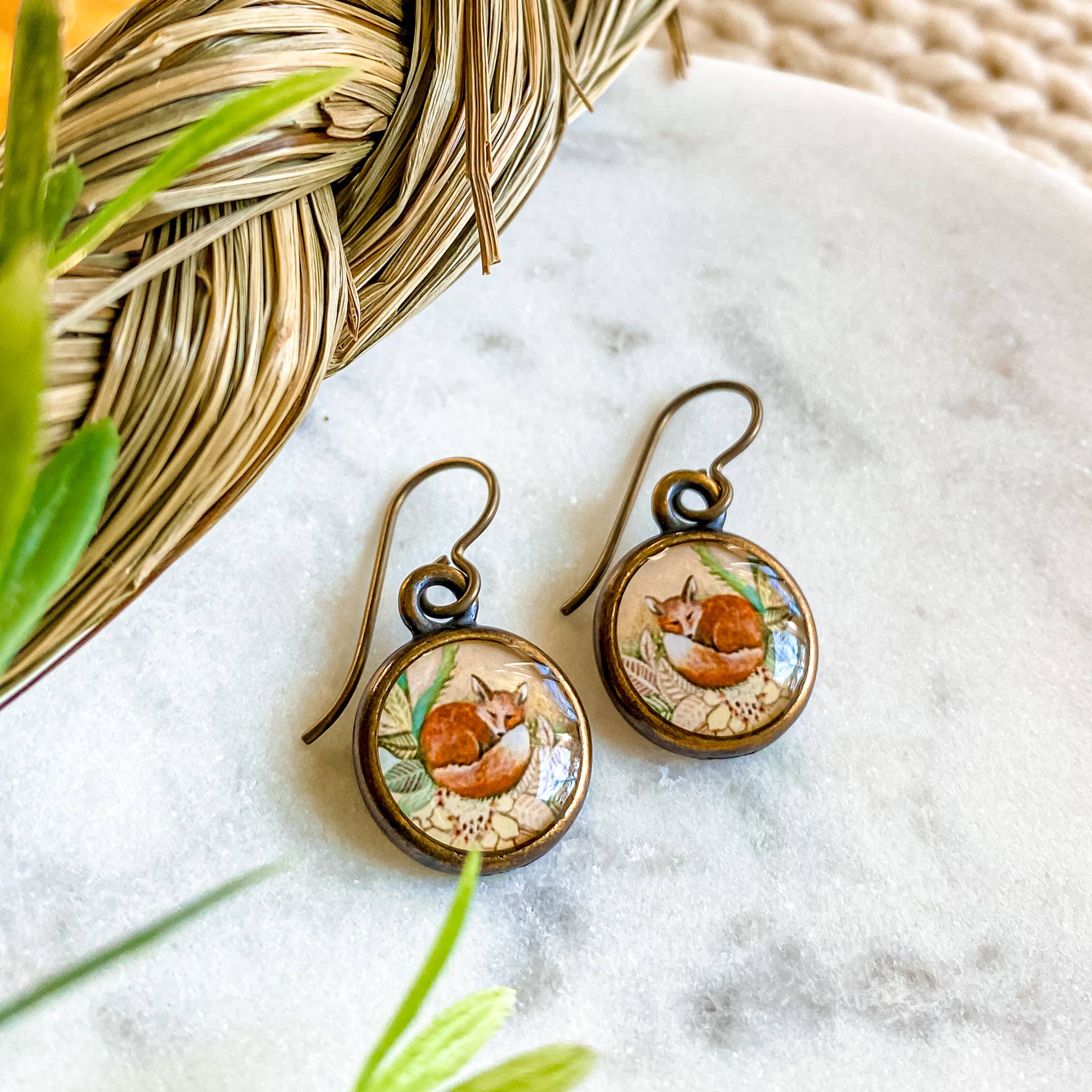 + Miniature print of an original Seed and Sky painting + Choose hypoallergenic niobium short ear wires or brass long ear wires + Lead-free and nickel-free (gentle for your skin) + 1/2 inch round oxidized brass pendants that have been tumbled and polished + The backsides features an etching of our maple seed logo + Earth-conscious practices and packaging 🌿 Each piece in the Seed and Sky collection is handcrafted in their North Carolina studio. Starting as an original artwork, it is transformed into a miniature print that is carefully set into a custom-cast bezel. To ensure lasting beauty and durability, the print is sealed with hand-poured resin, giving it both protection and a luminous shine.