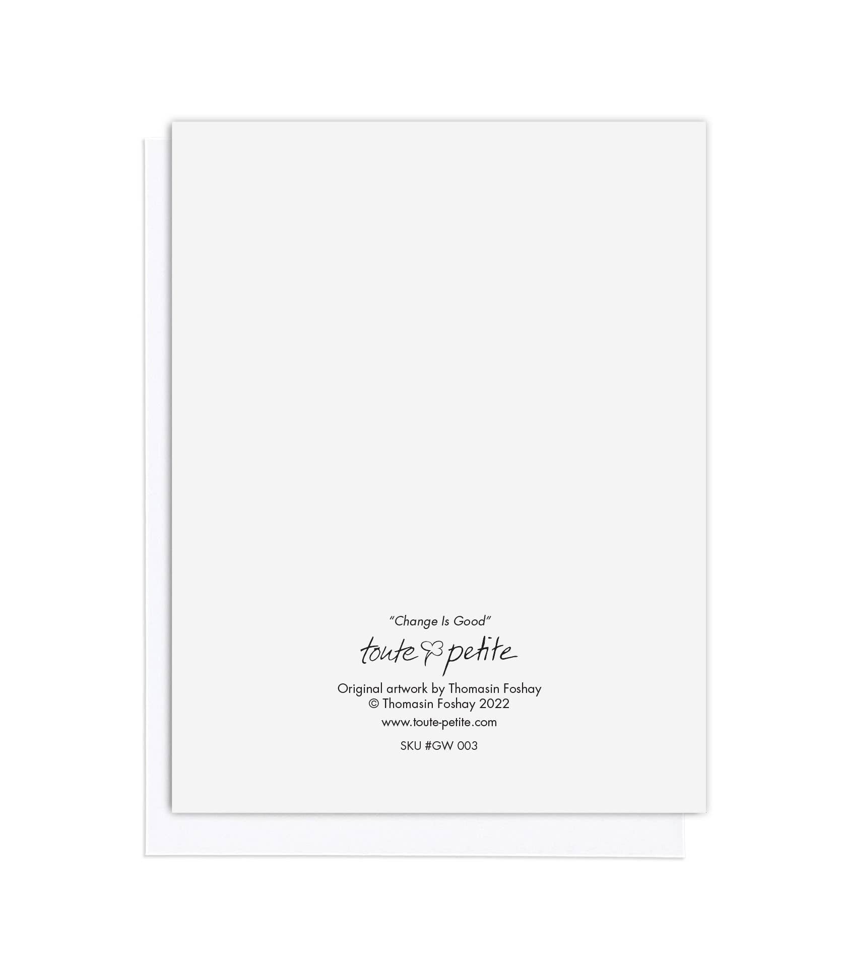 Change is Good is the title of this greeting card. The phases of the Monarch's life are a wonderful metaphor for our own personal achievements, life goals and personal fulfillment. This greeting card is one of our best sellers and is great for retirement, graduation, get well, to instill inspiration and just because. Toute-Petite is a woman-owned stationery and small gift brand based in Charlottesville, Virginia. Blank Inside