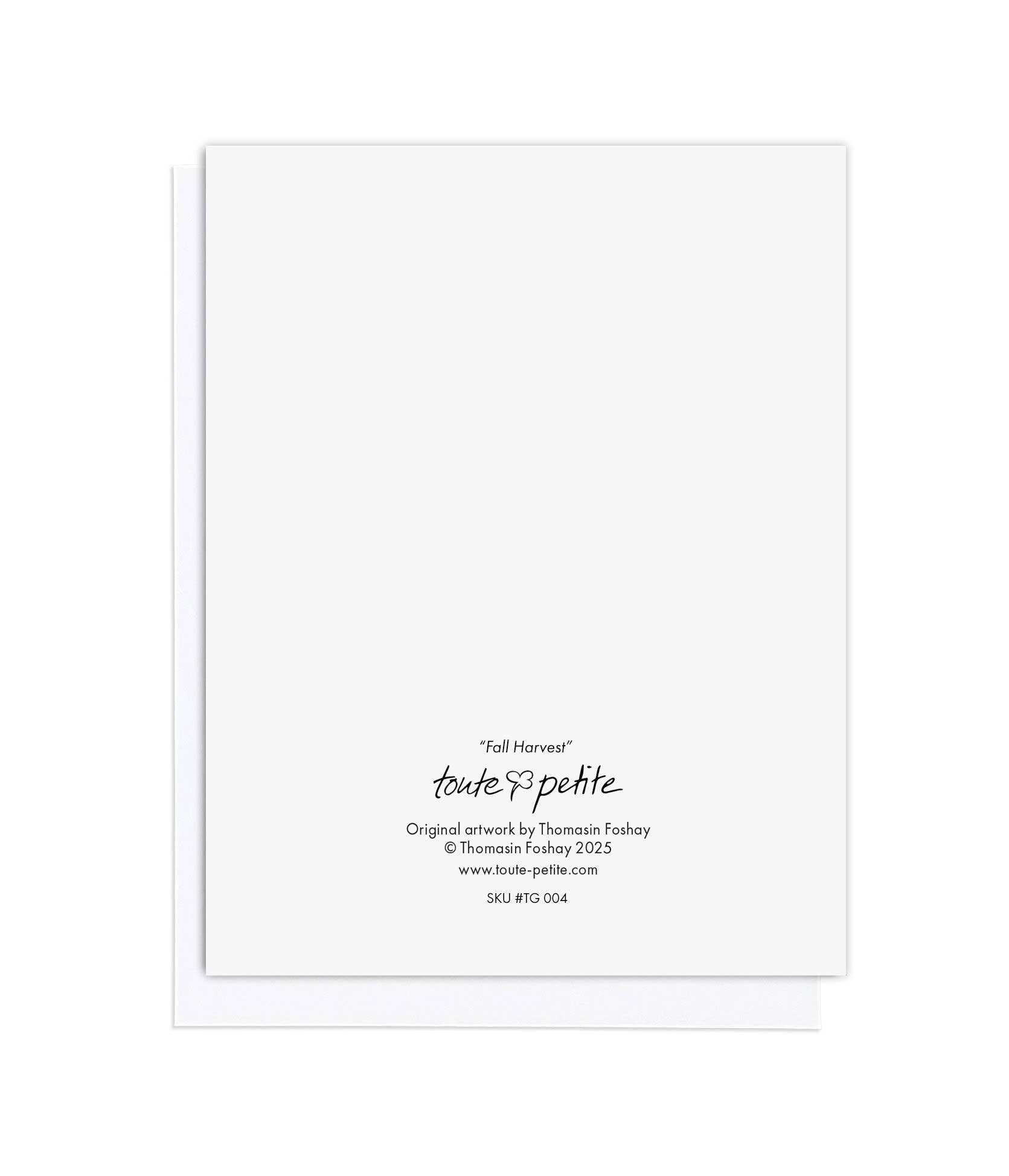 A greeting card showing a bountiful, colorful arrangement of newly harvested apples, pumpkins and corn. This greeting card is wonderful for Thanksgiving, Autumn and thank you. Toute-Petite is a woman-owned stationery and small gift brand based in Charlottesville, Virginia. Blank Inside