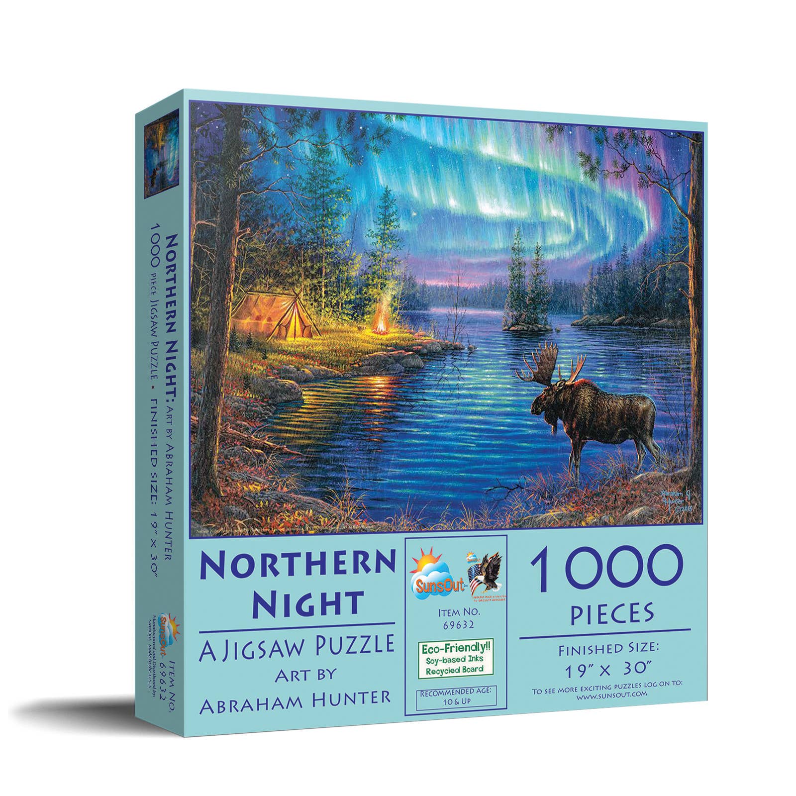 1000Pc. Size:19x30. Artist Name: Abraham Hunter northern lights, moose, lake, outdoors, wildlife